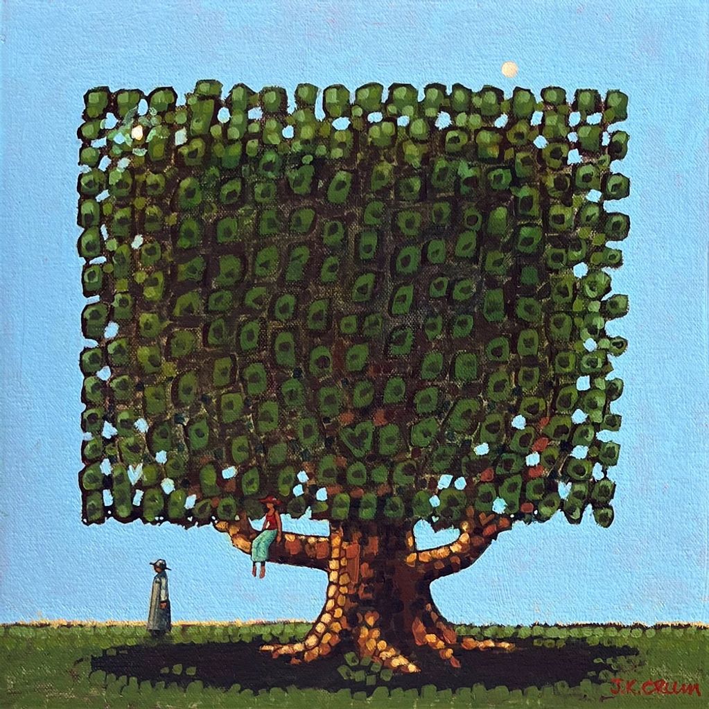 I created this piece as our weather cooled, inspiring the beginning of autumn The tree serves as an anchor, creating a sense of solitude, strength, and quiet contemplation. Surrounding its base the heart-shaped fallen leaves create the symbol of love. Figures on the path emphasize the human scale within a vast natural world.