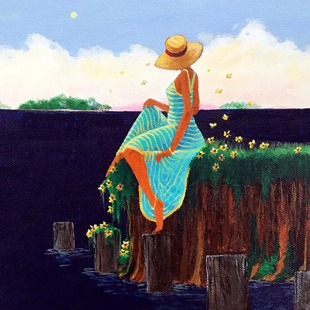 This painting will uplift your spirits with a dose of hope and positivity. An exploration of gentle surrealism, blending dream with reality evokes a sense of curiosity. The color palette creates a fresh and lively atmosphere, crucial to the invigorating mood. Perched at the island edge, a lover awaits for her companion to return.